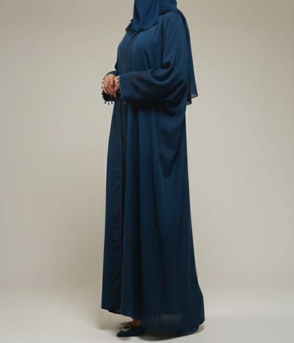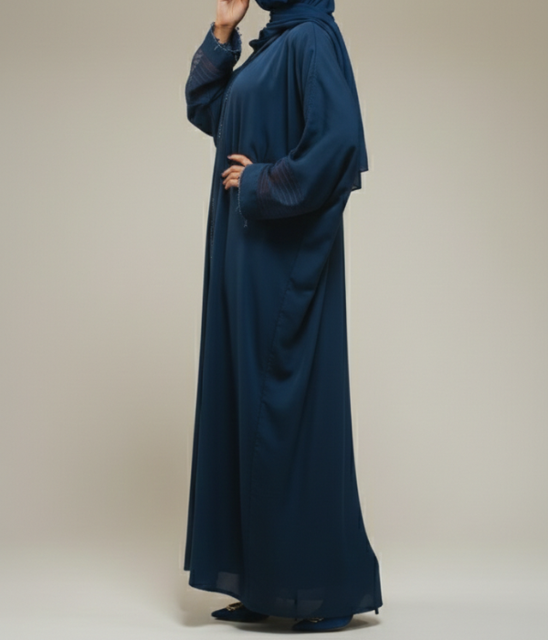 Elevate your style with our latest Premium Nidha Abaya. Crafted from high-grade Nidha fabric, this abaya offers a luxuriously smooth feel and a beautiful, heavy drape. The deep navy palette provides a timeless canvas for its unique artisanal details, making it a standout addition to any wardrobe.