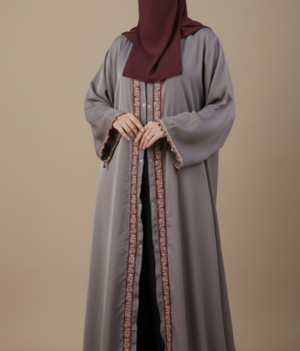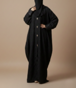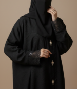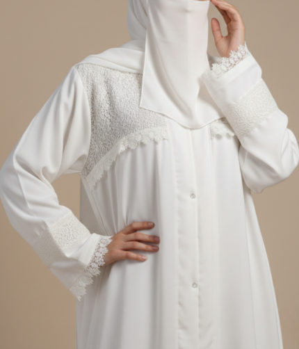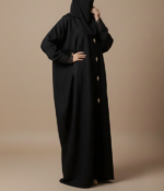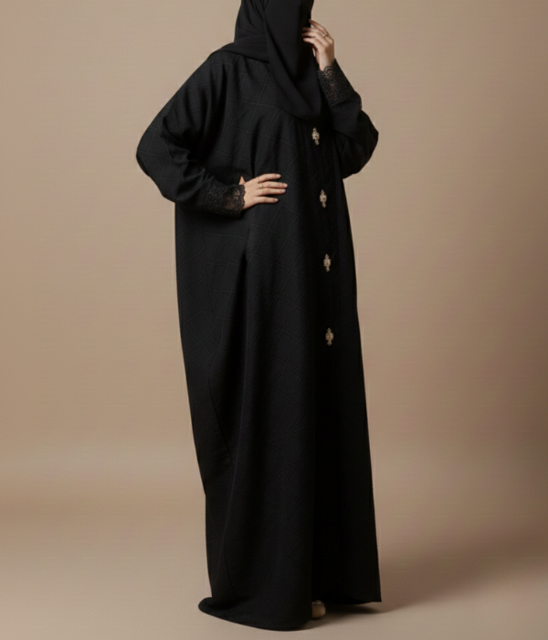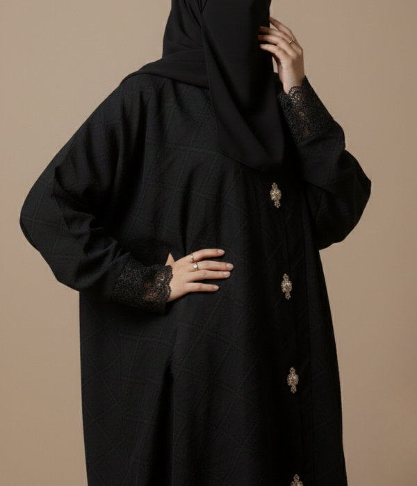The design is elevated by delicate lace-trimmed cuffs and a series of ornate jewel-encrusted buttons down the front, providing a touch of shimmer and luxury. With its opaque finish and generous flow, this abaya ensures you stay comfortable and covered without sacrificing your personal style.